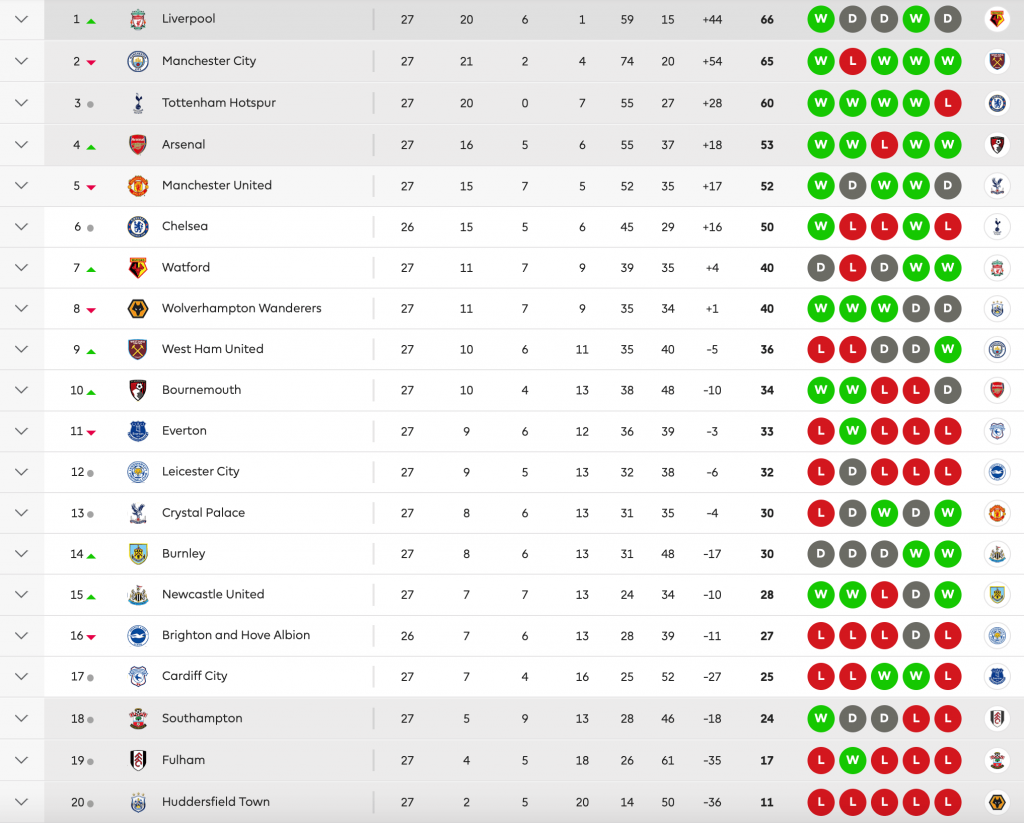 – Huddersfield. ‘Lăsați-ne să ne pregătim de Championship!’ Acesta ar putea fi motto-ul potrivit pentru evoluția terrierilor din acest sezon. Echipa condusă de Jan Siewert este gata să doboare toate recordurile negative. Cu 11 puncte acumulate în 27 de etape, cele mai puține goluri marcate (14) și cele mai multe înfrângeri (19), Huddersield ajunge totodată în topul cartonașelor roșii încasate. Eliminarea lui Tommy Smith în minutul 20 a egalat recordul deținut de Everton și Leicester (4).