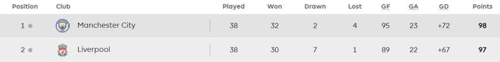 - recordurile bizare atinse de Liverpool: în oricare alt sezon din istoria Premier League, în afară de acesta și cel precedent, ambele adjudecate de Manchester City, 97 de puncte ar fi adus titlul;