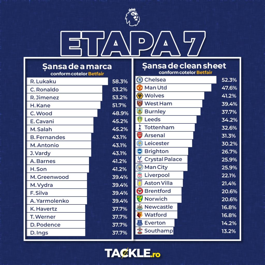 Șansele pentru clean sheet și pentru marcatori în GW7 (conform cotelor Betfair)